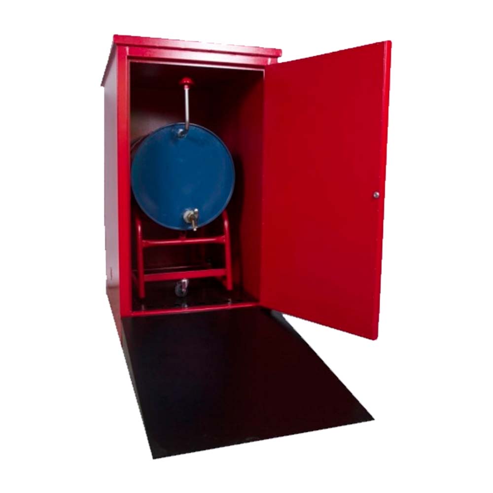 O armário corta fogo para tambores de 200 litros modelo vertical e ou horizontal são construidos com chapa de aço carbono interna e externamente, entre as chapas será preenchido com uma camada de isolante resistente. Possui abertura na parte superior e na parte inferior com duplo sistema corta chama CERTIFICADO PELA FM GLOBAL TECHNOLOGIES LLC. que funciona como respiros de ventilação para gases leves e pesados. O único armário projetado para resistir a 900 graus celsius por 1 hora. Terá uma base na parte inferior construida com perfilado de chapa U reforçado, com uma porta e travamento em 3 pontos com maçaneta e duas chaves. Este possuirá um fundo falso que funcionará como diques de contenção, teto corta fogo e pingadeira. Este armário será pintado na cor vermelho. Este armário atende as regulamentações da N.F.P.A., O.S.H.A, NR 20, NB 98, da Portaria 3214/78 e UL1275.