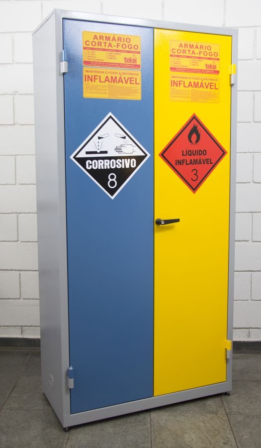 Apesar de ser um armário corta fogo para corrosivo ele deve dispor de um adesivo sinalizador de MANTENHA O FOGO A DISTANCIA- INFLAMAVEL ( KEEP FIRE AWAY) bem como também o adesivo com as instruções de uso e normas compatíveis ao produto, porem cabe assinalar no quadrante corrosivos para mantê-lo devidamente sinalizado .