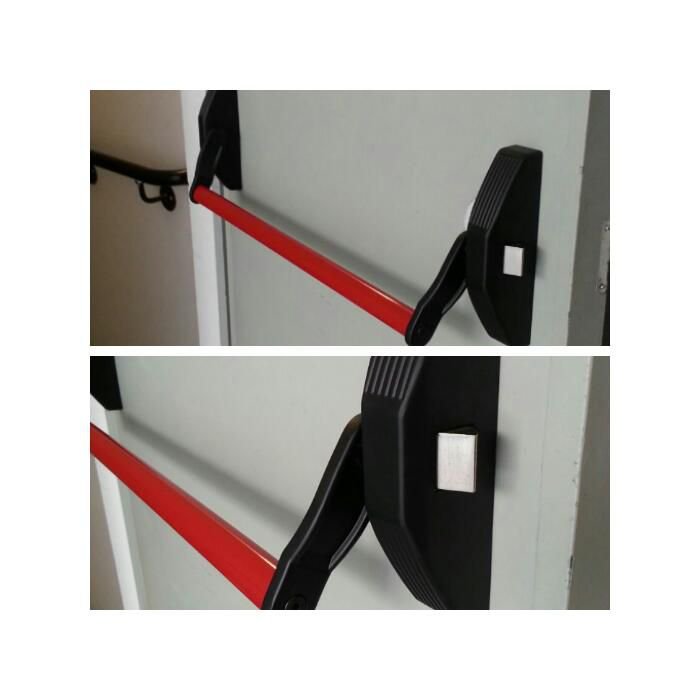 A barra anti pânico padrão (kit padrão de 1 folha travamento vertical ) serve para portas de até 1100mm largura por 2200mm altura